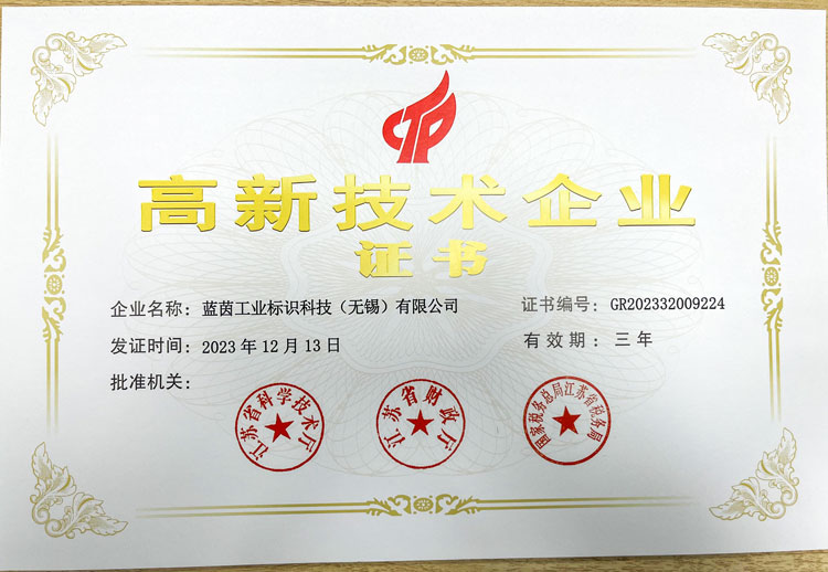 近日,藍茵工業(yè)標識科技(無錫)有限公司喜獲國家級“高新技術(shù)企業(yè)證書”,成為國家高新技術(shù)企業(yè),并頒發(fā)了證書。此次藍茵LIONTEC取得的《高新技術(shù)企業(yè)證書》,發(fā)證審批機關(guān)分別為江蘇省科學(xué)技術(shù)廳、江蘇省財政廳、國家稅務(wù)總局江蘇省稅務(wù)局。證書的頒發(fā)充分說明了國家相關(guān)部門對藍茵