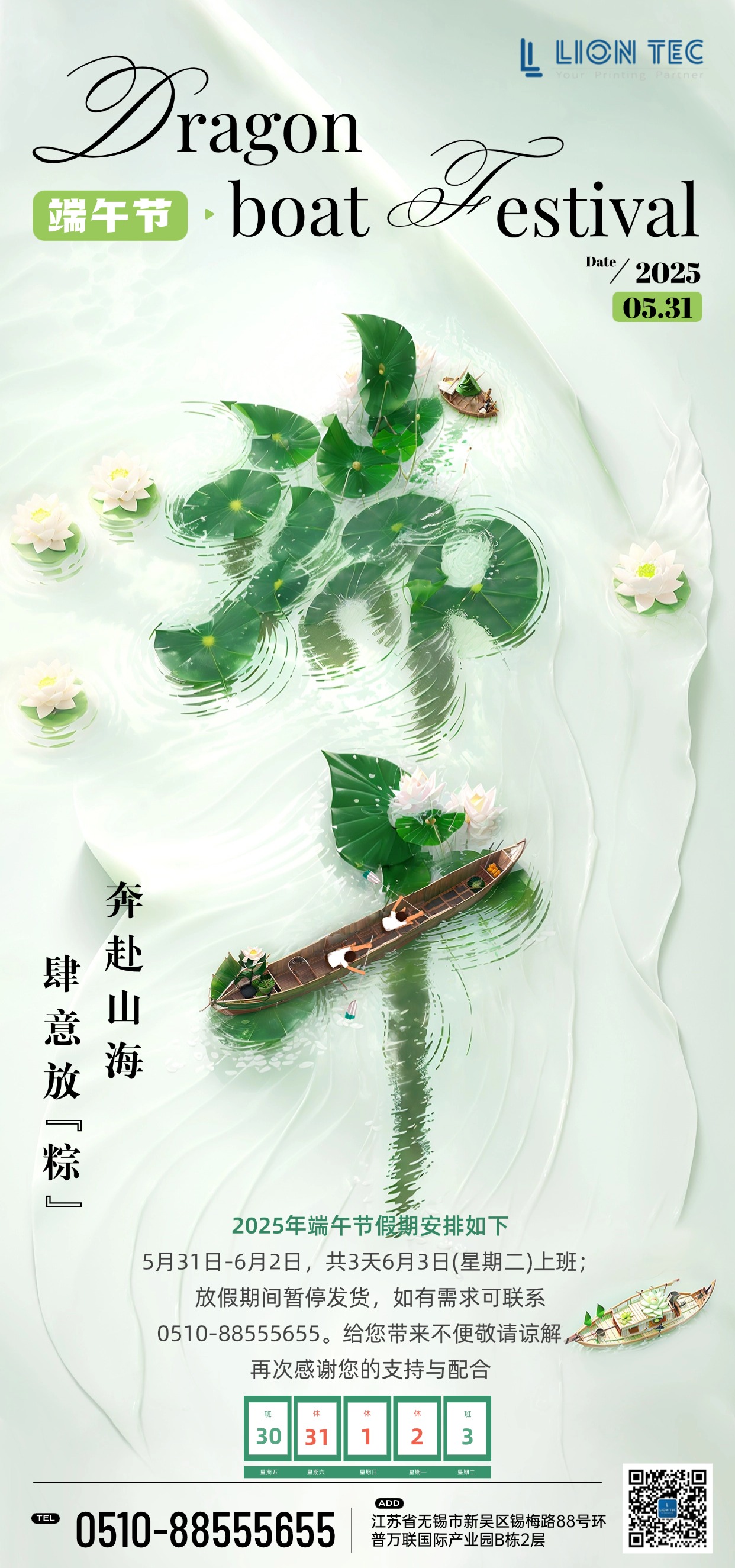花開半夏,雨落成詩,端午已至,祝君安康!五月初五端午節(jié)即將到來,根據(jù)國家法定節(jié)假日固定,噴碼機廠家-藍茵現(xiàn)將2025年端午節(jié)放假安排通知如下: