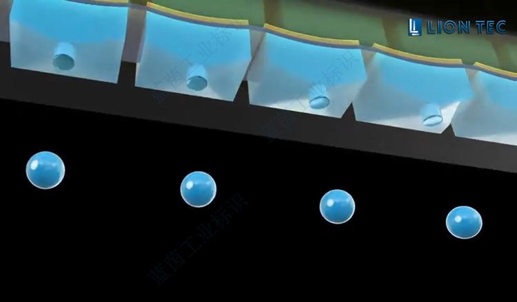 微壓電打印頭的關(guān)鍵部件是壓電元件,通常是壓電陶瓷,它能因?yàn)殡娏鞯淖兓a(chǎn)生相對(duì)應(yīng)的形變。微壓電打印頭正是利用了這一原理。在壓電式噴墨打印頭微型墨水儲(chǔ)存器后面采用了一塊壓電晶體,當(dāng)對(duì)壓電晶體施加電流時(shí),會(huì)使其向內(nèi)彈壓,當(dāng)電流中斷時(shí),壓電晶體又會(huì)反彈回到原來(lái)的位置,同時(shí)會(huì)將一滴微量的墨水通過(guò)噴嘴噴射出去,當(dāng)電流再次恢復(fù)時(shí),晶體又向外延伸,這樣就進(jìn)入了噴射下一滴墨水的準(zhǔn)備狀態(tài)。由于微壓電技術(shù)的每一個(gè)噴頭墨倉(cāng)都有一塊這樣的壓電晶體,以此控制墨水的噴出,并且由于加的電壓的大小直接導(dǎo)致了形變的多少,因此噴頭噴出來(lái)的墨滴大小能夠通過(guò)電流輸出的曲線(xiàn)而精準(zhǔn)控制,壓電噴墨打印技術(shù)對(duì)墨滴的控制能力強(qiáng),而且墨的的形狀更加規(guī)則,定位更加準(zhǔn),打印分辨率高,更容易實(shí)現(xiàn)高精度的打印。UV噴碼機(jī)核心噴頭部件正是利用了這一先/進(jìn)的工作原理,得以實(shí)現(xiàn)高精度、高解析的噴印效果。